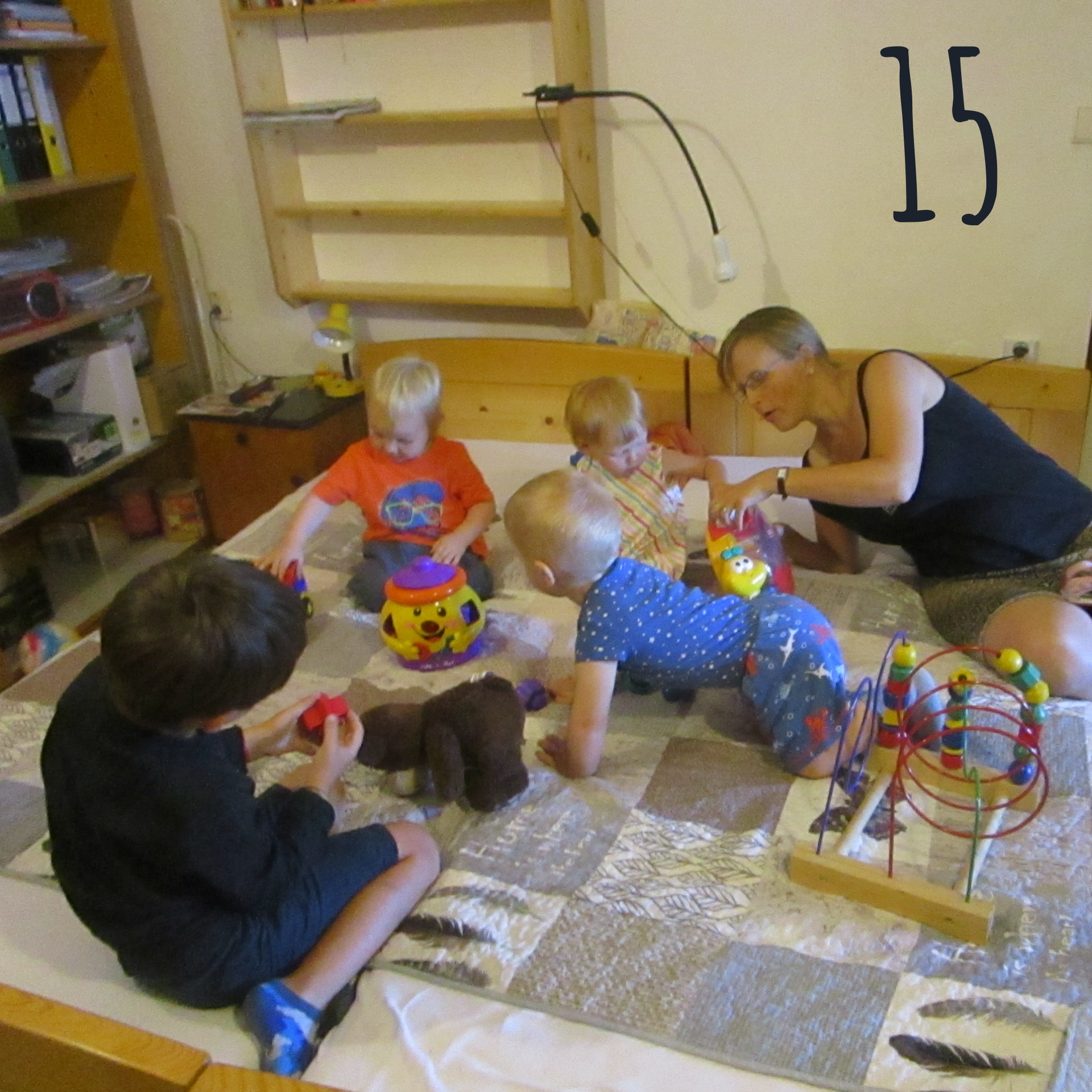 Nad čelo Rosťovy postele ještě přibyla knihovna. Pepíkova postýlka byla vedle skříně, pěkně odstíněná od průchodu ode dveří ke dveřím. Vyfocené to nemám - jediná fotka, která demonstruuje rozložení, je tahle z návštěvy dětí u nás.