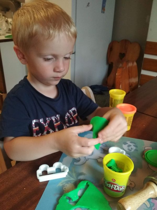 Když jsem viděla, jak moc jej tvoření baví, pořídila jsem mu sadu doplňků -razítka a vykrajovátka. Opět - jak jinak -používá jen dvě nejoblíbenější, traktor a vlečku.